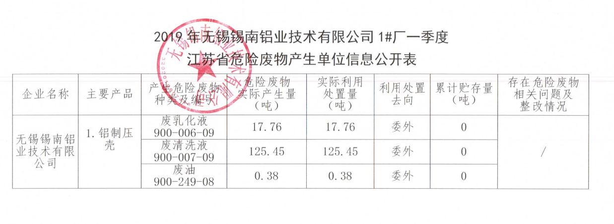 江蘇省危險(xiǎn)廢物產(chǎn)生單位信息公開(kāi)表(一季度)